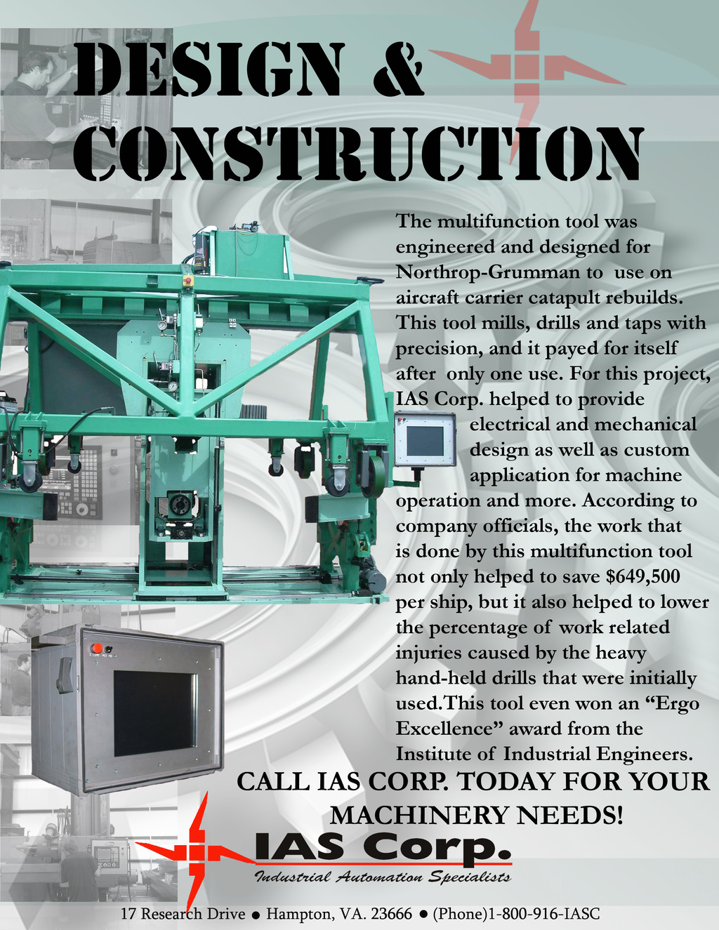 IAS Corp. Solution: IAS Corp., together with Newport Cutter Grinding, created a prototype machine that automated work once done by sailors using heavy hand-held drills. Weighing as much as 40 pounds, these drills made onboard wrist injuries and fatigue commonplace. Almost immediately the “Multi-Function Tool” helped reduce on-the-job injuries by 25%, and its ease of use and quick cycle times added up to a savings of $649,500 per ship. The “Multi-Function Tool” won Northrop-Grumman an Institute of Industrial Engineers "Ergo Excellence" award, which recognizes companies that find innovative and cost-saving ways to improve the work environment. (Click here for more [VA Pilot story from April 14 2007]) The “Multi-Function Tool”has since gone through multiple modifications, yet the original prototype is still in use today. Click here for more information.
